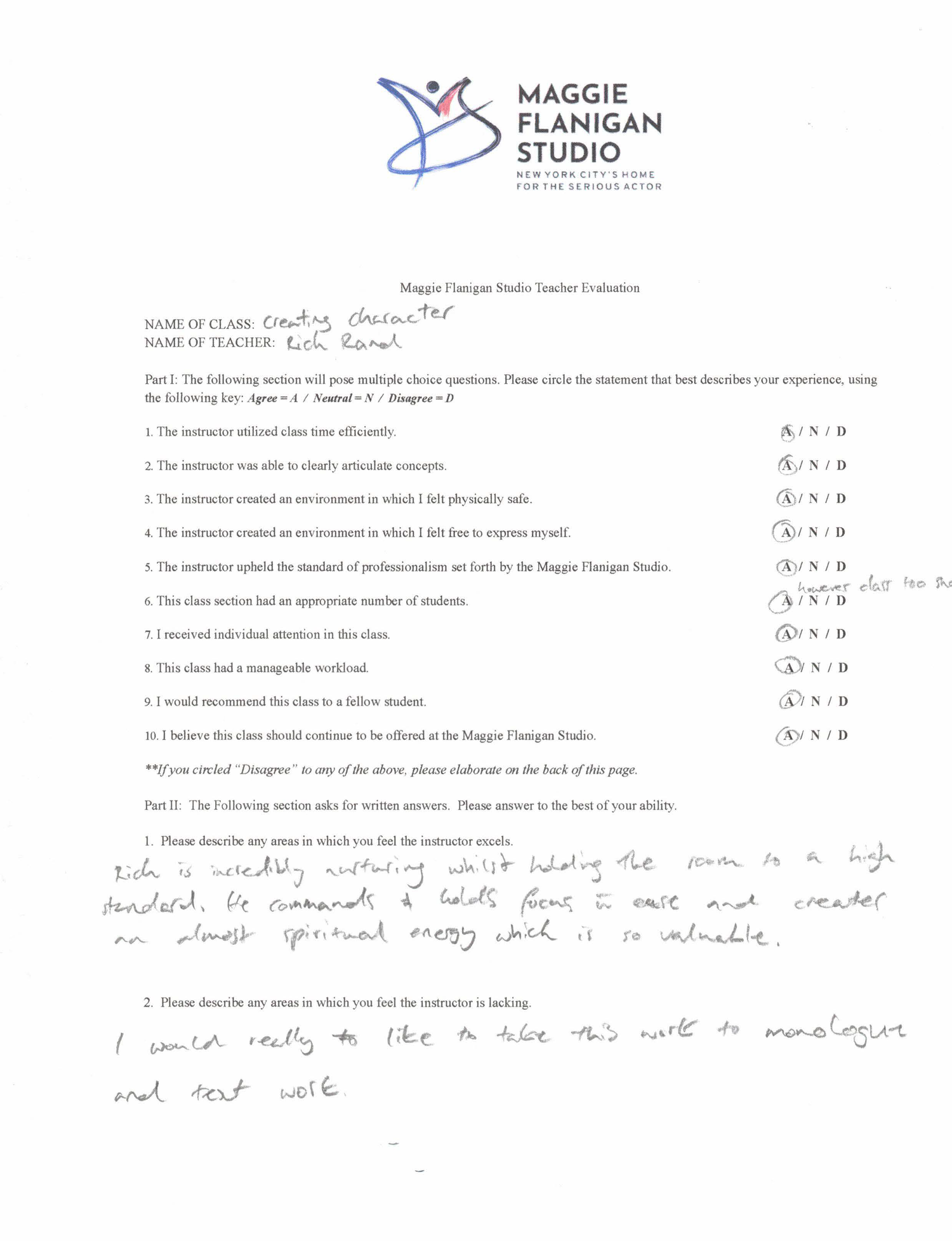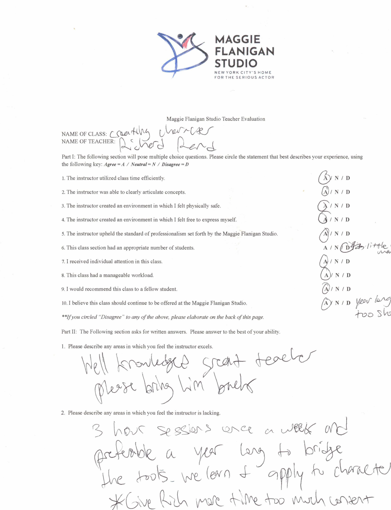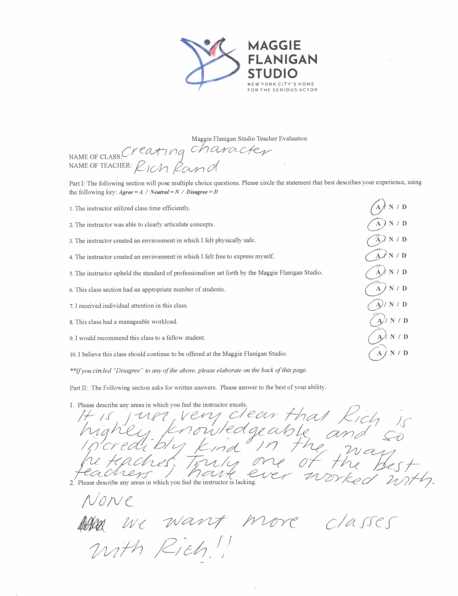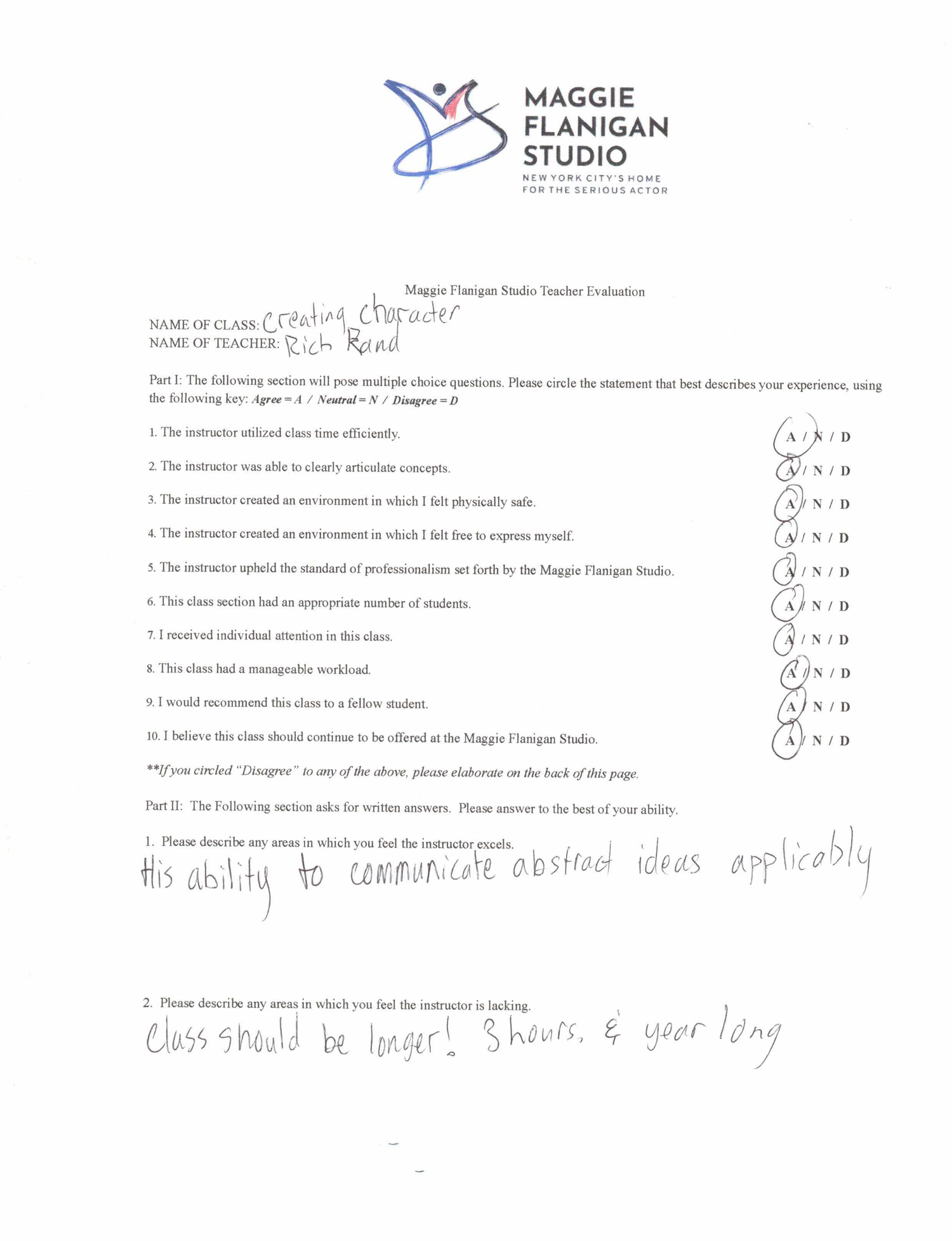 "You taught me to look deeper and harder at the characters we all possess within…You’re a tough teacher and I respect you for that! I won’t forget the skills that you taught me and I won’t forget that it was you who sparked…ignited my interest in stage movement! I only hope that one day I can be a teacher like you. Thank you, Rich Rand!!"